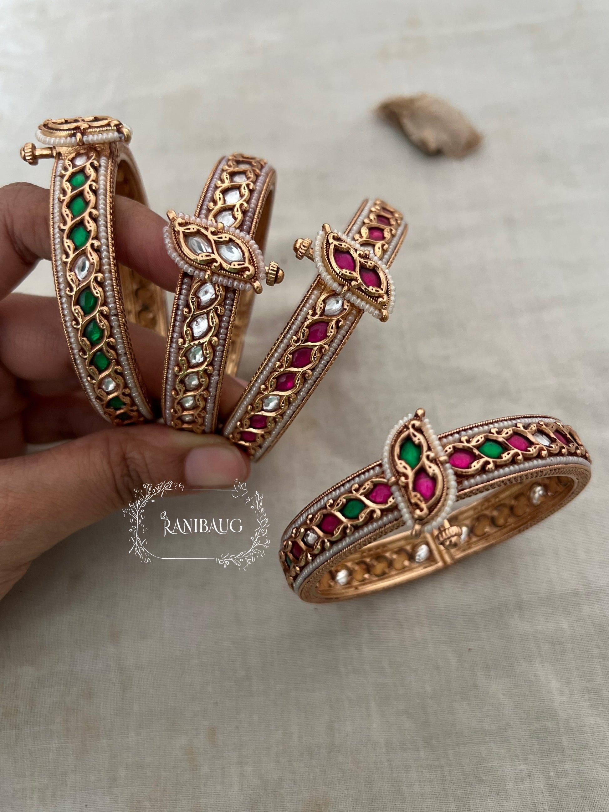 Each "Ambi" Kada is a masterpiece of intricate design. A graceful vine of brilliant Polki stones and vibrant colored gemstones meanders around the bangle, framed by delicate pearl borders and set in a rich antique gold finish. The collection is offered in several classic colorways—all-Polki, ruby red, emerald green, and a festive red-and-green mix—making them perfect for personalizing your look. The ornate, pearl-studded clasp is a beautiful focal point, completing this stunning piece of wearable art.