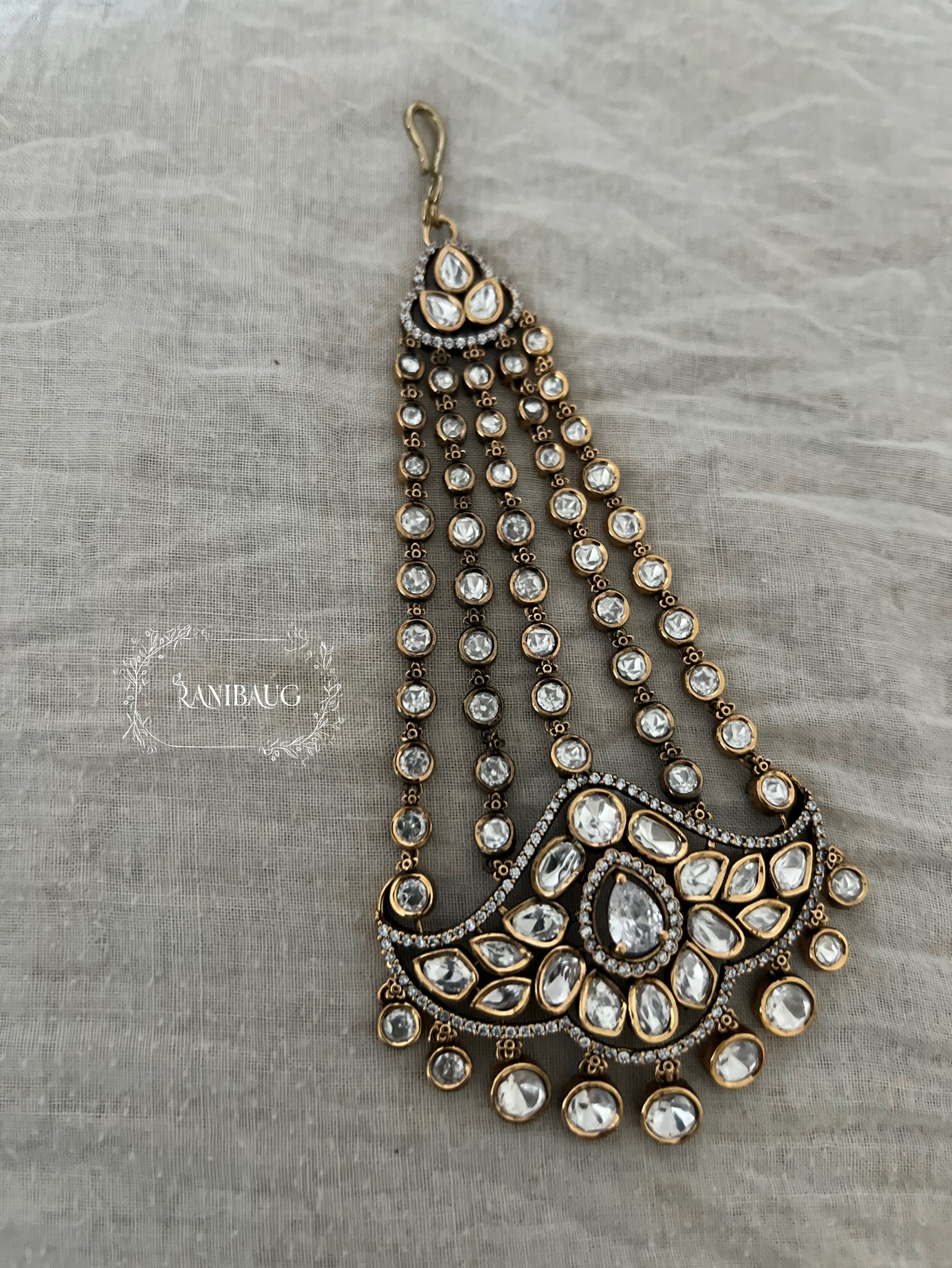 Presenting the Ranibaug Sleek Minimalist Kundan Passa—an elegant take on traditional passa with a very contemporary vibe. This light-weight passa has delicate cascading chains featuring glistening round kundan stones, topped with a gently curved base that fans out gently off to the side of the head; perfect for brides or festive occasions, with understated luxe.