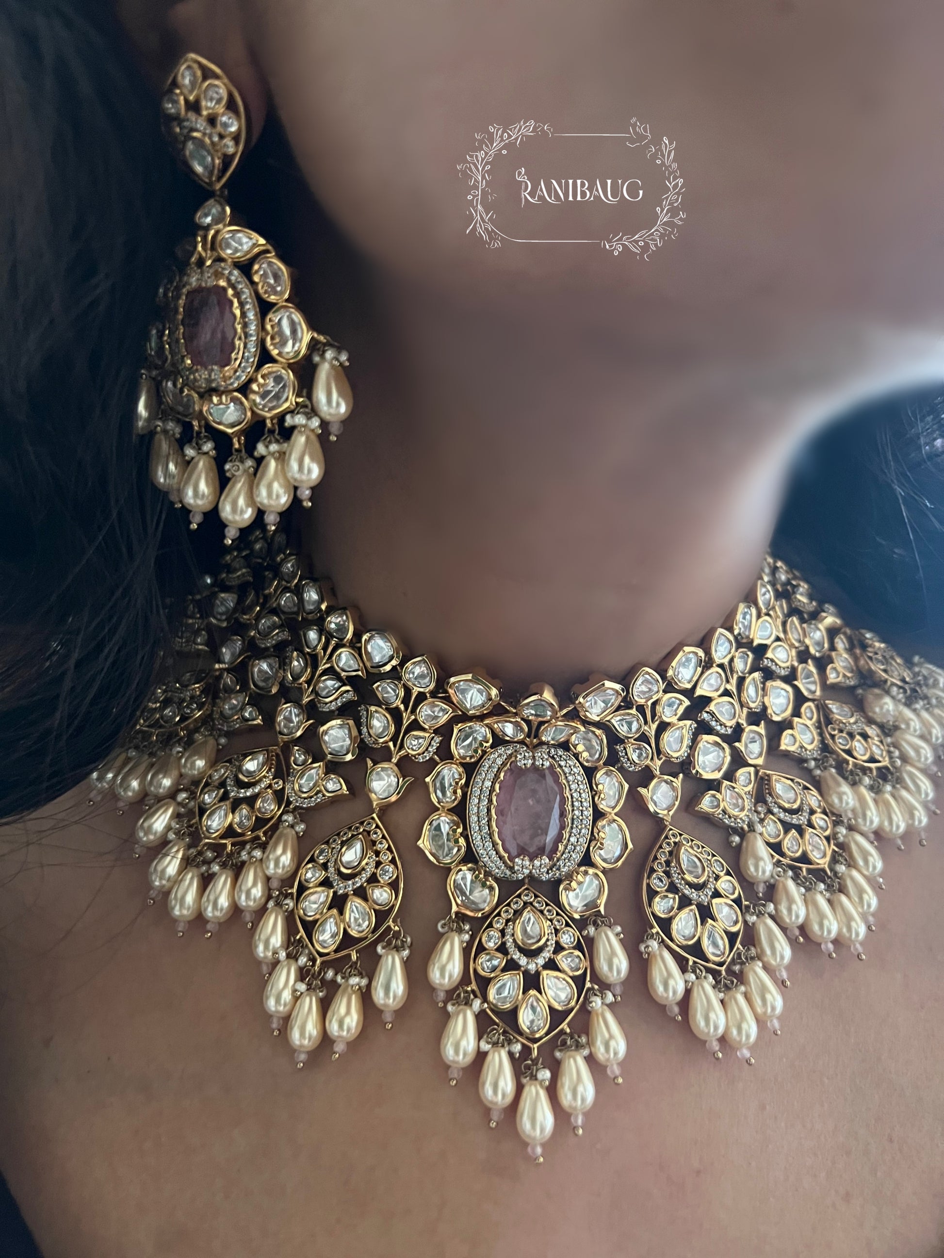 Design: Traditional wide choker bridal set with heavy Polki work.