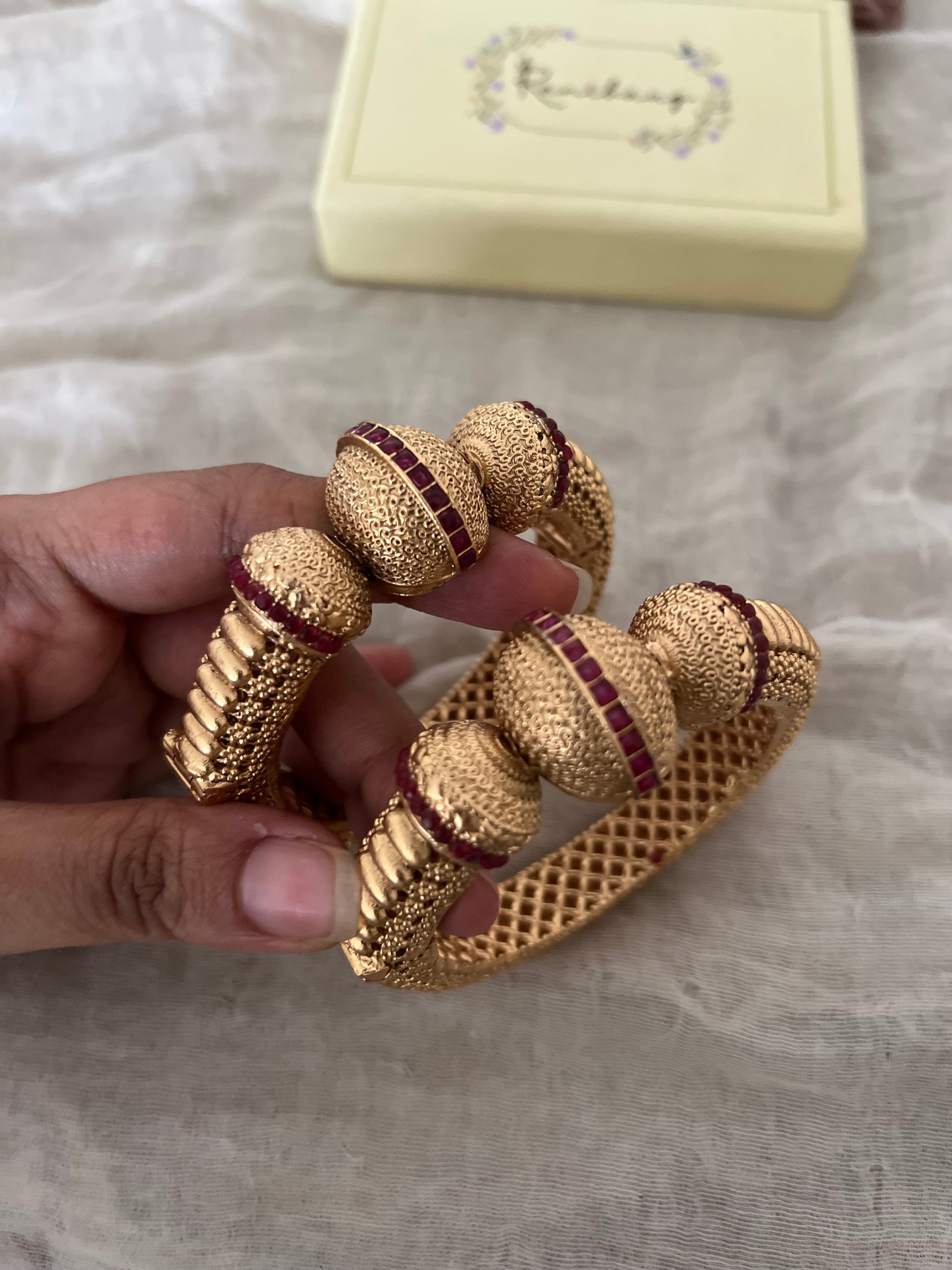 Each kada is a formidable piece of craftsmanship, constructed from a series of large, spherical golden beads that give the bangle a magnificent, three-dimensional silhouette. These globes are a tour de force of textural detail, featuring a fine, stippled or granulated (rawa) finish that creates a rich, matte effect. Each sphere is bisected by a vibrant, channel-set band of ruby-red kemp stones, adding a flash of royal color and contrast. The spheres are connected by articulated, ribbed sections, enhancing the architectural feel of the piece. The entire bangle is bathed in a warm, antique gold finish, giving it the powerful presence of a treasured heirloom.