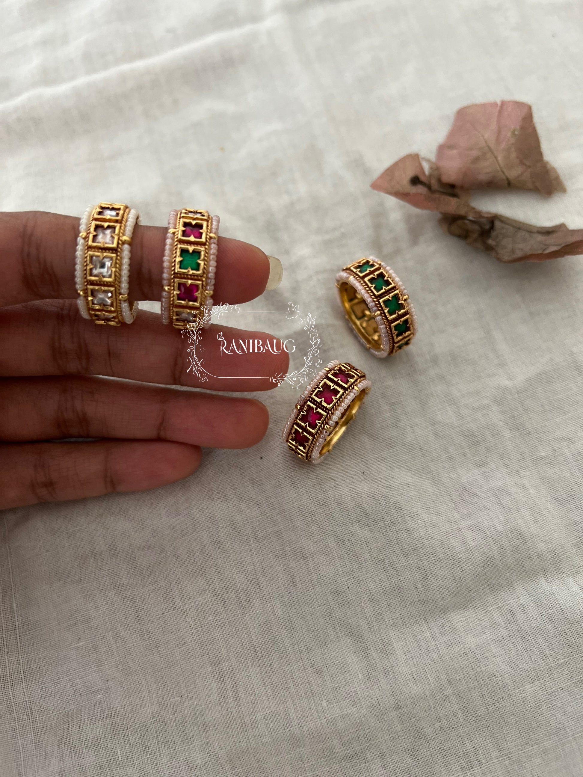 These rings are the Ranibaug collection’s signature band-style designs, featuring a grid of vibrant colored stones—ruby red, emerald green, and classic kundan white—set within gold-plated bands and bordered with delicate white stone accents. The broad, richly detailed bands embody both traditional grandeur and a modern, stackable vibe.