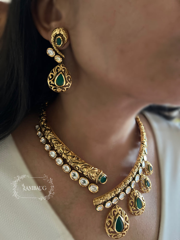 The necklace is designed as an asymmetrical open collar, featuring two thick, handcrafted tubes of carved antique gold. One side culminates in a magnificent, emerald-studded finial, while the other blossoms into a cascade of brilliant Polki stones and teardrop-shaped gemstone pendants. The design is a dynamic conversation between solid, sculptural form and delicate, cascading light.