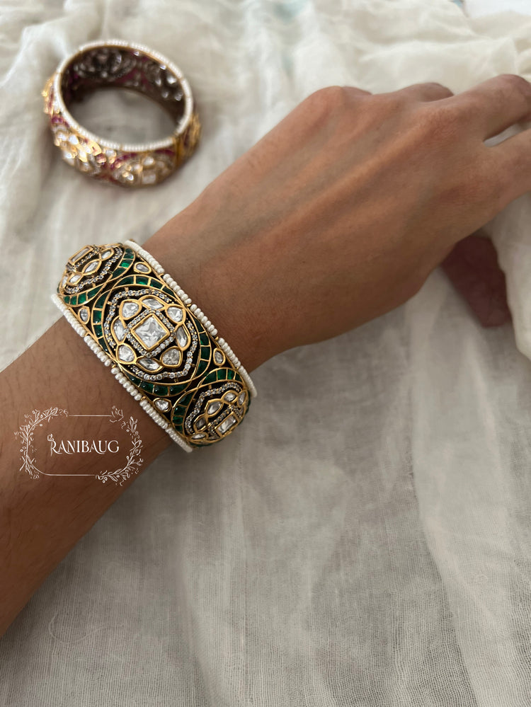 Each kada is a canvas of vibrant Meenakari enamel, available in a choice of majestic emerald green or royal ruby red. Upon this rich, colored base, master artisans have meticulously placed brilliant, uncut Kundan stones within intricate gold-plated settings, reminiscent of Mughal-era jewelry designs. The design is perfected with a delicate border of luminous pearls, adding a touch of softness and sophistication to the bold design. These openable kadas are secured with a finely crafted clasp, blending traditional artistry with modern convenience.