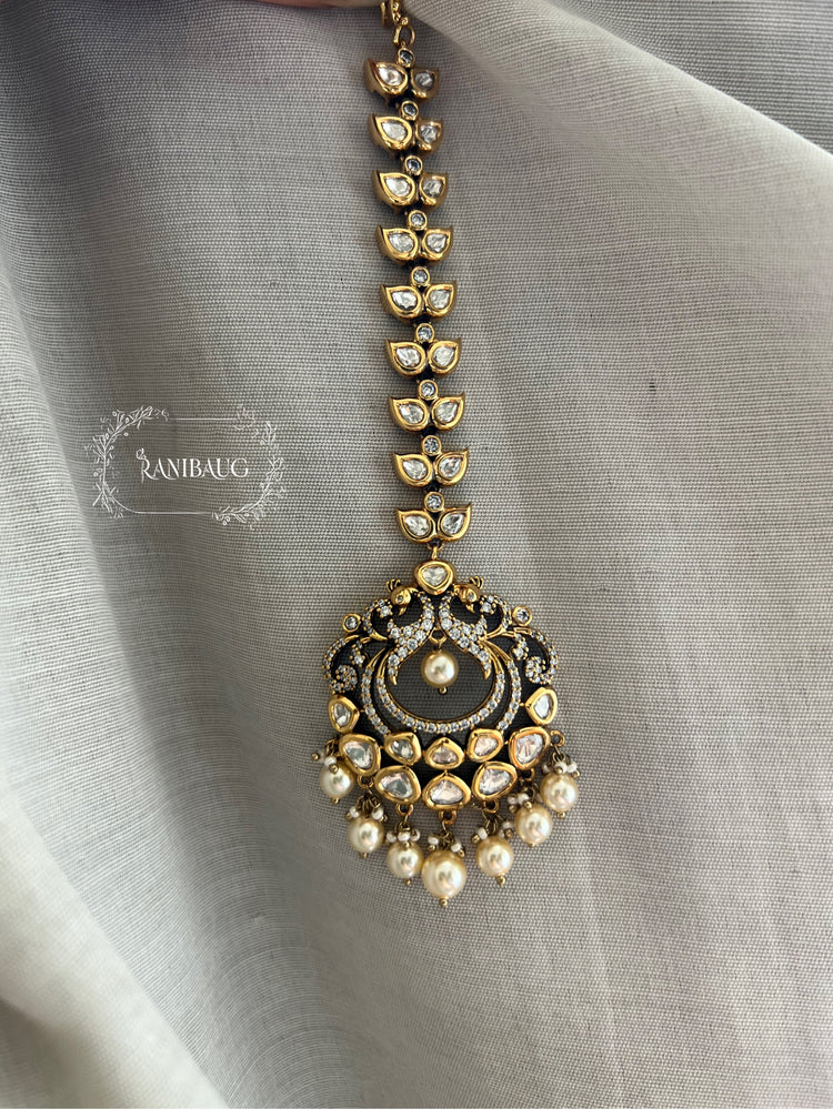 This Ranibaug chand-circular Kundan maang tikka is designed for lovers of tradition, statement sparkle, and timeless Indian elegance.