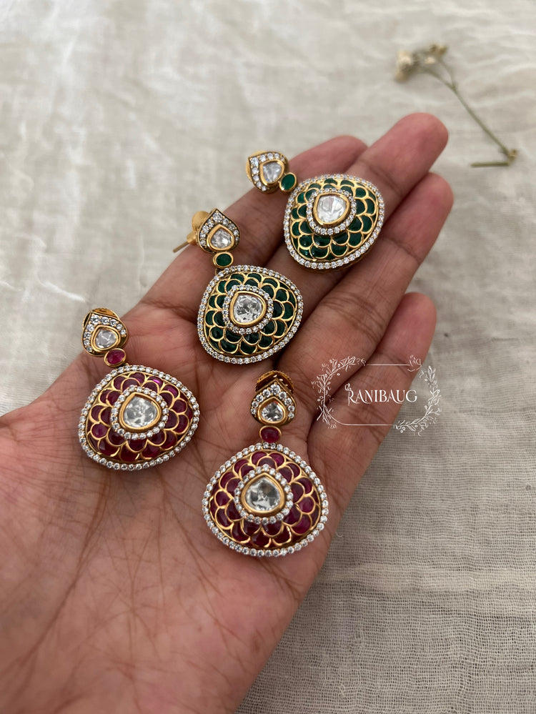 Experience royal grandeur with the Chavi Jadau Dangler Earrings from Ranibaug. Intricately handcrafted with Meenakari-style petals and luminous polki stones. Available in Ruby Red & Emerald Green. The ultimate statement piece for bridal and festive wear.