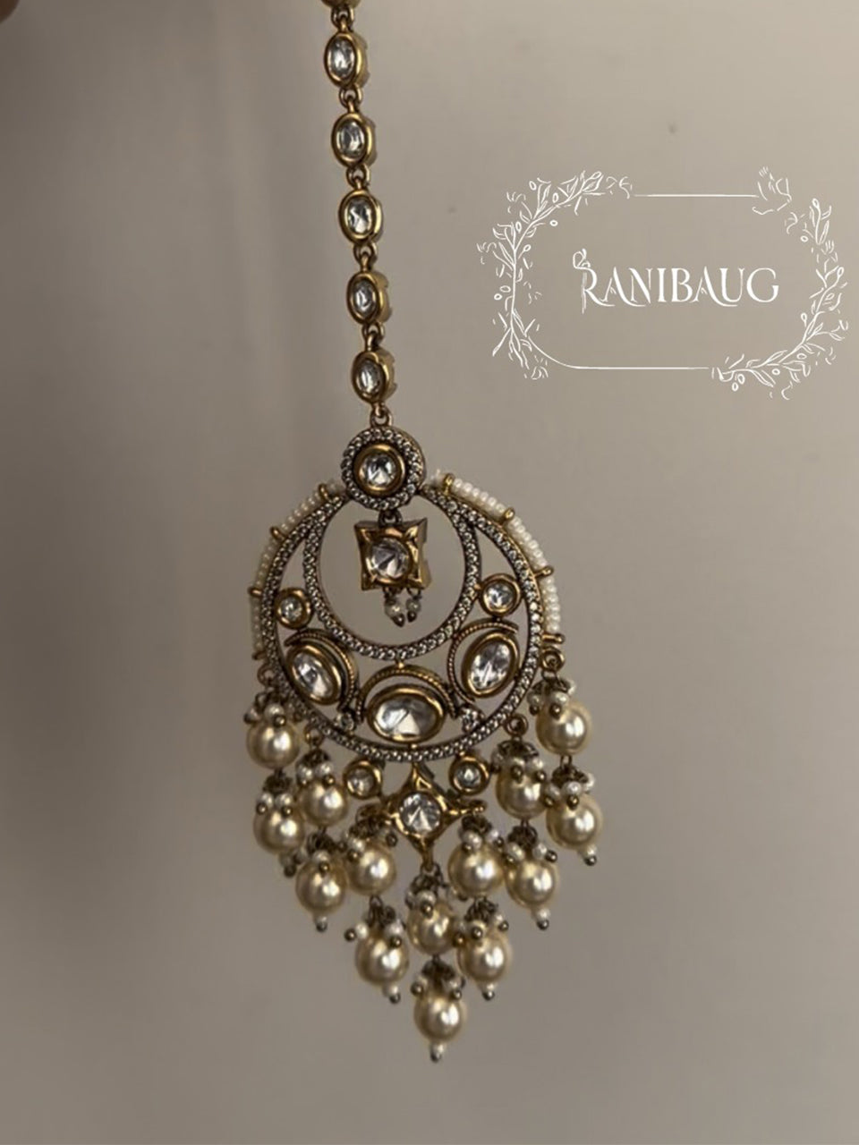 This jewelry piece from Ranibaug is a regal, gold-plated maang tikka designed with intricate polki kundan work and elegant pearl hangings, making it a statement accessory for both bridal and festive occasions.