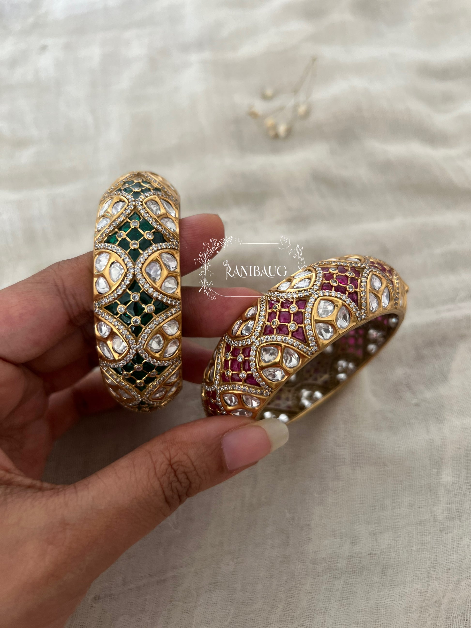Available in a majestic ruby red or a noble emerald green, each "Rajmahal" Kada is a spectacle of intricate design. The surface is a rich field of faceted gemstones, over which a vine of brilliant, uncut Polki stones gracefully meanders. The entire piece is encased in a delicate, crystal-studded golden lattice, creating an effect of unparalleled depth and sparkle. With their substantial feel and magnificent finish, these kadas are destined to be the centerpiece of any bridal or grand festive ensemble.