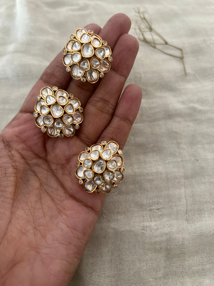 Make a bold statement with these stunning cocktail-style earrings! Featuring a large dome-shaped cluster of sparkling petal-cut mossainite stones arranged in a modern honeycomb pattern, each stone framed in warm gold bezels for a regal glow. The soft, rounded silhouette catches light beautifully from every angle, adding luxe dimension to your look. Their clear mossainite kundan and gold neutral palette makes them perfect for pairing with anything—from everyday ethnic wear to dazzling festive ensembles. Elevate your jewelry collection with this versatile piece that blends traditional craftsmanship and contemporary style effortlessly.