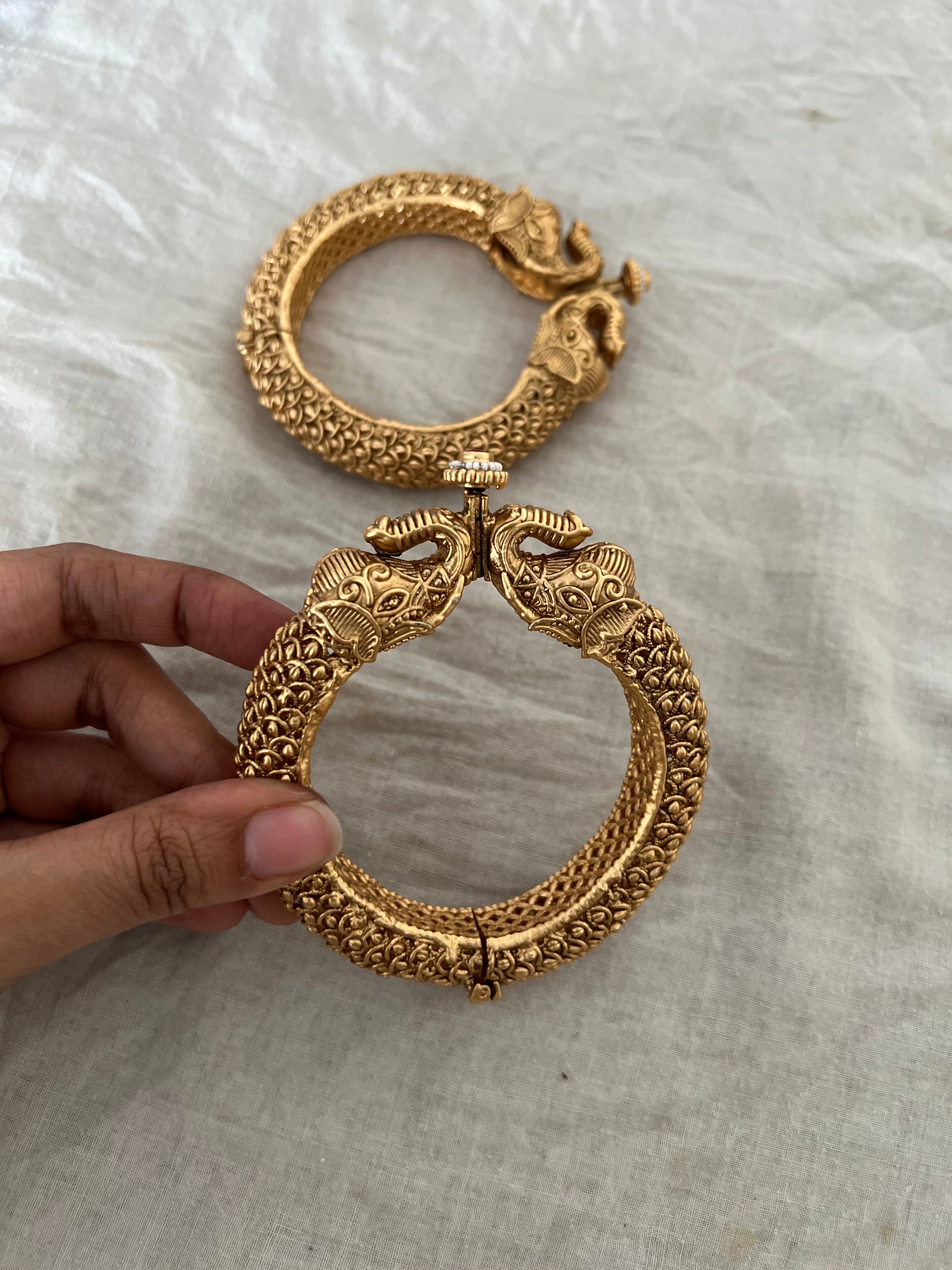 Each kada is exquisitely crafted, culminating in two magnificent peacock heads that meet face-to-face. The terminals are richly detailed with fine, traditional carvings, a delicate crest, and a sparkling kundan stone at the center. The body of the bangle is a canvas of intricate, scale-like textures, all bathed in a warm, antique gold finish that lends the piece a powerful and distinguished heirloom quality.