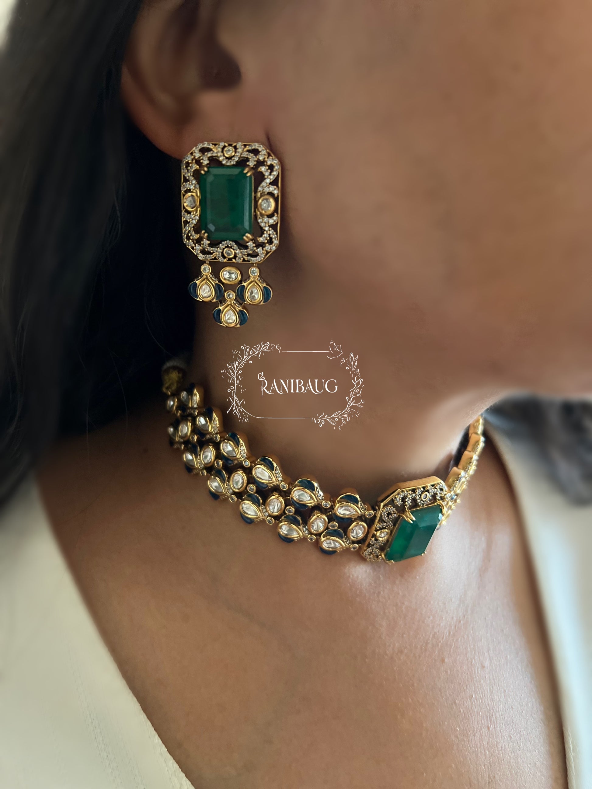Commanding yet refined, the Ranibaug Royal Emerald Polki Choker Set is crafted for women who carry heritage with confidence. Centred around striking emerald-cut stones, this piece channels the grandeur of royal courts while embracing a contemporary sense of strength and poise.