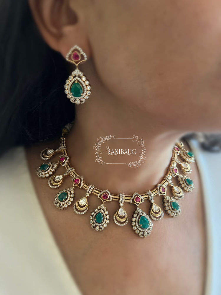 The necklace is a masterpiece of design and contrast. A textured, antique gold-plated band forms the foundation, from which a series of exquisite teardrops dangle with captivating grace. Large, pear-shaped emerald green stones, haloed in brilliant zircons, alternate with luminous uncut Kundan drops, creating a rhythmic dance of color and light. The design is punctuated with deep ruby-red stones, adding a touch of fiery elegance. The matching earrings are a statement in themselves, echoing the rich green and sparkling halo of the necklace's main motifs.