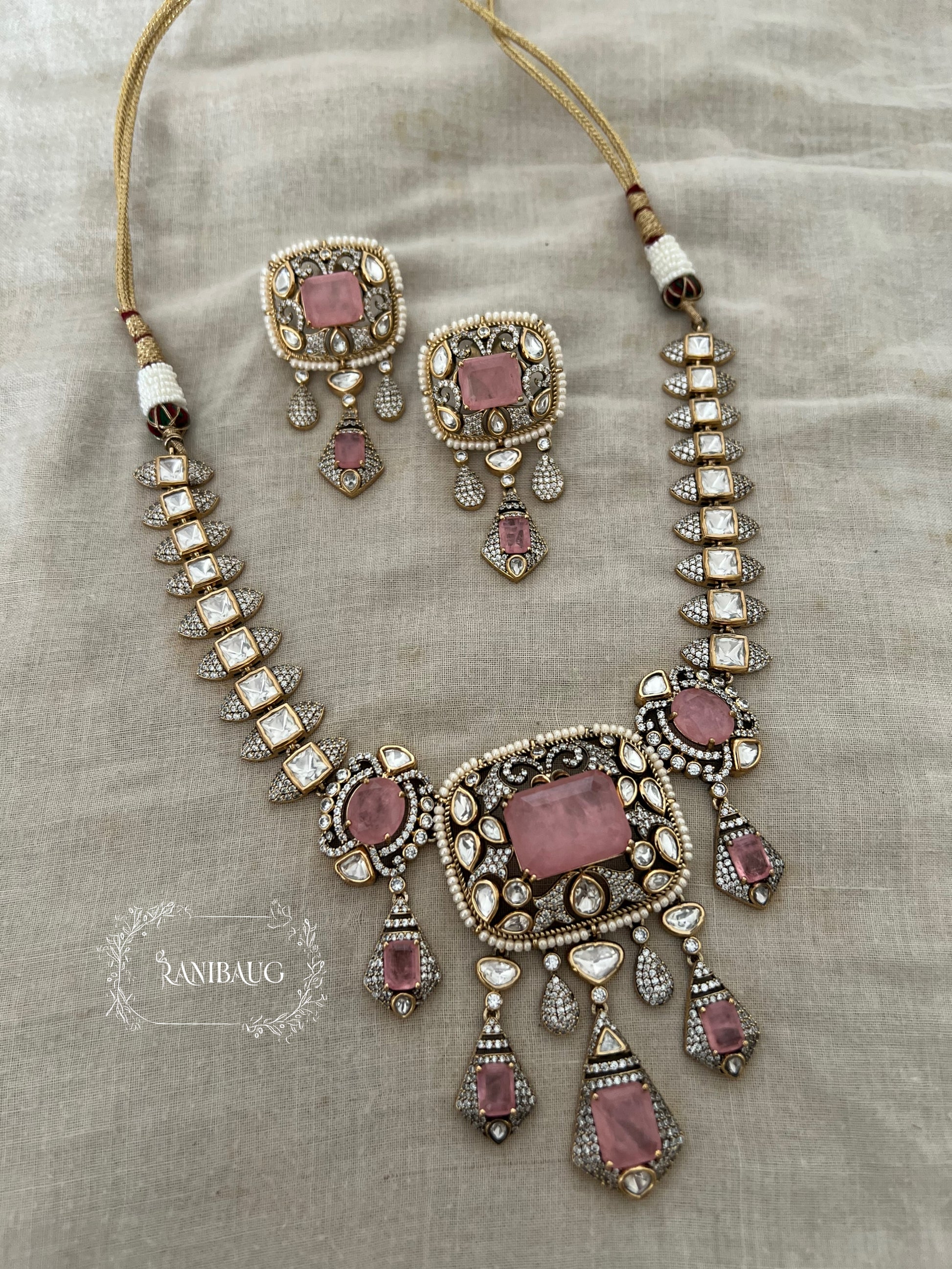 Krishika Vintage Statement Jewellery Set Adorned With Mint And Pink Gemstones Polki Studded In Premium Gold Finish By Ranibaug