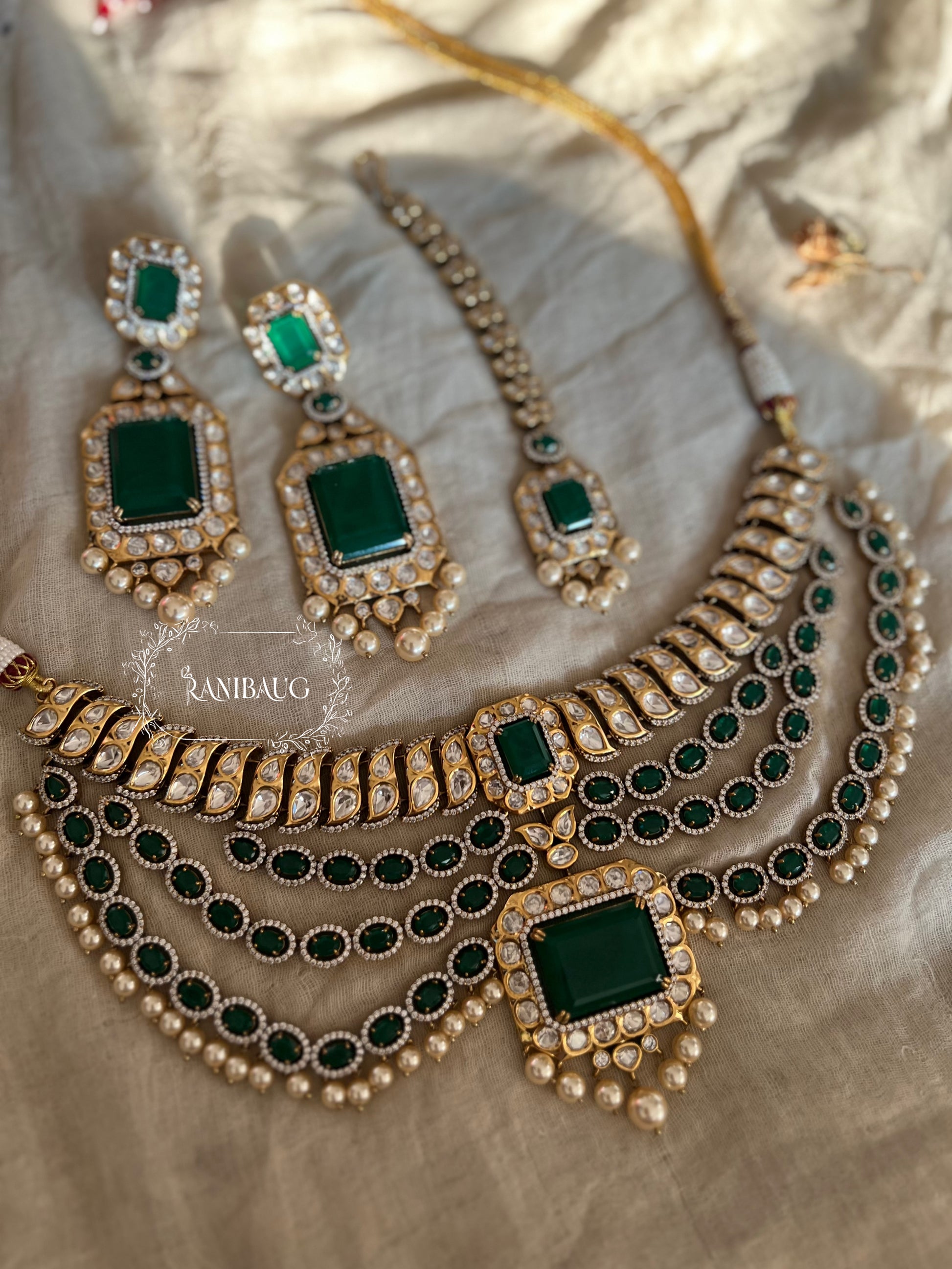 Three sumptuous cascades of deep green, hand-cut semi-precious emerald ovals sweep gracefully below, each bead rimmed with fire-polished stones and brilliant American diamonds. The crowning element: a spectacular rectangular emerald centerpiece—framed in polki and delicate pearls—a motif drawn from regal thrones and ceremonial treasures. A dainty string of gold-plated pearls finishes each row, lending motion and timeless grace.