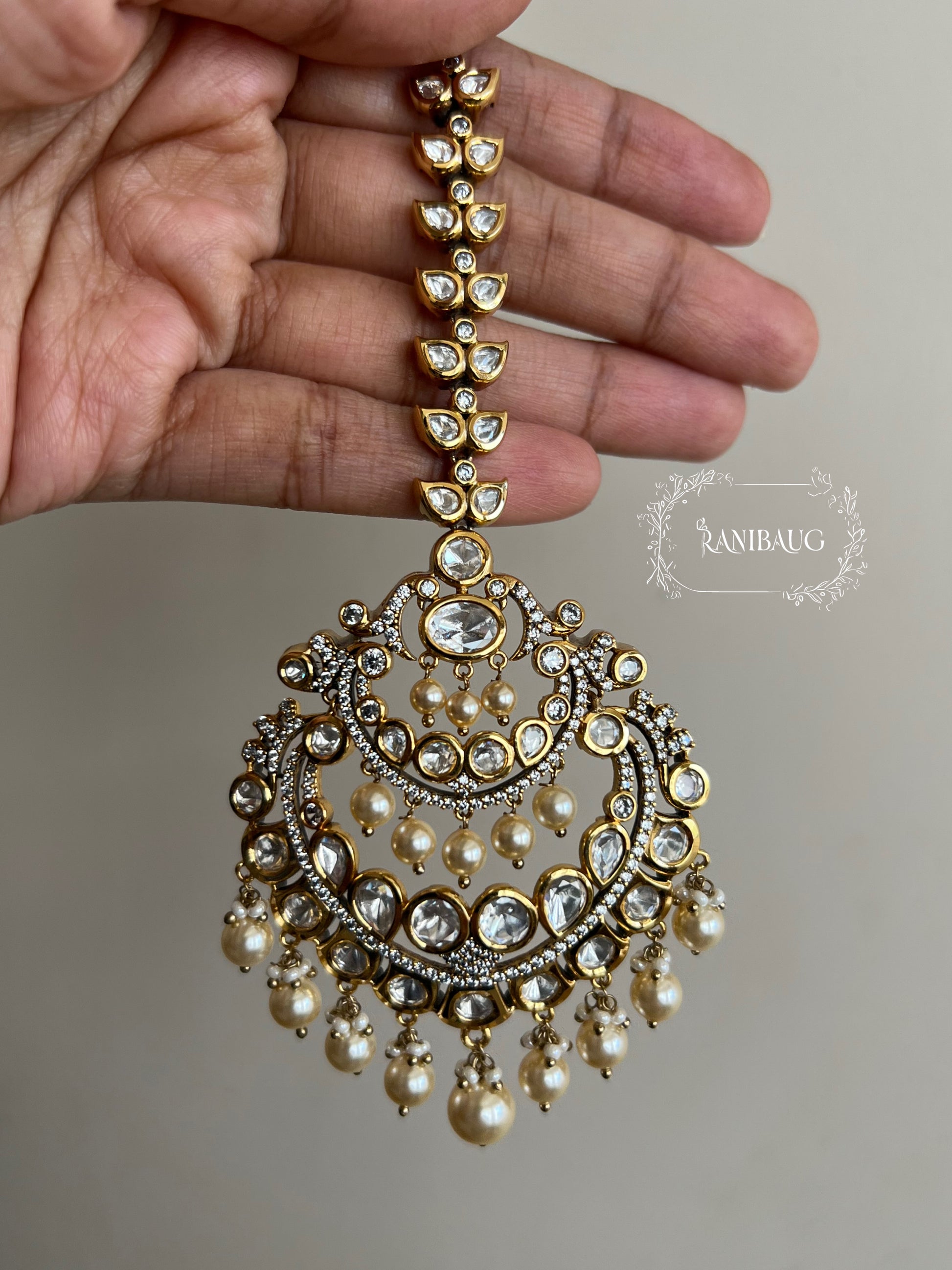 This Ranibaug maang tikka is a grand statement piece that beautifully merges opulent crescent motifs, sparkling Kundan stones, and luxurious pearl fringe—perfect for bridal, sangeet, or high-celebration looks.