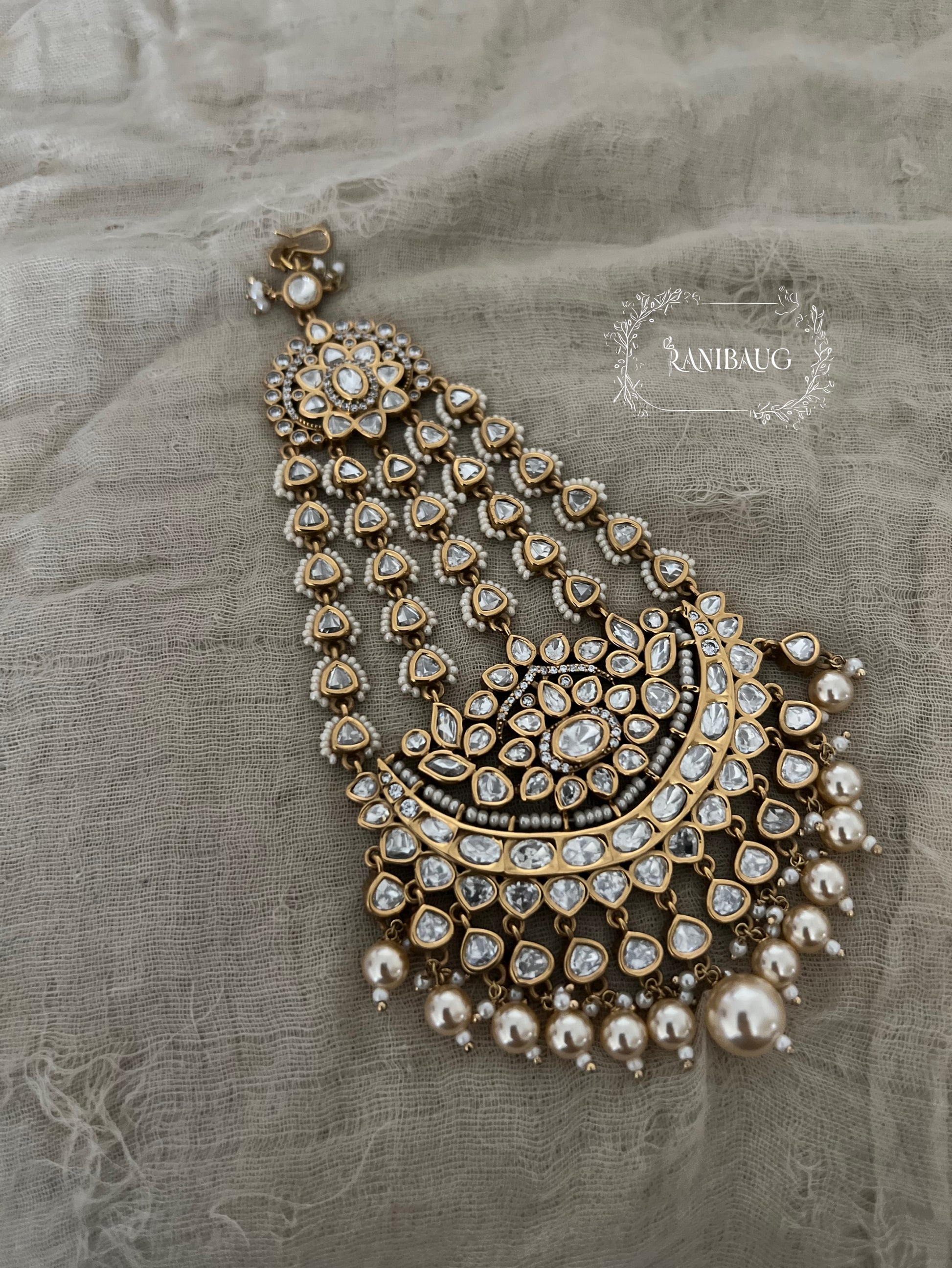 This Passa is a truly memorable bridal piece due to the harmonious blending of artistry with a medal of kundan, fine pearls, and an alluring silhouette when showcasing at a grand event.
