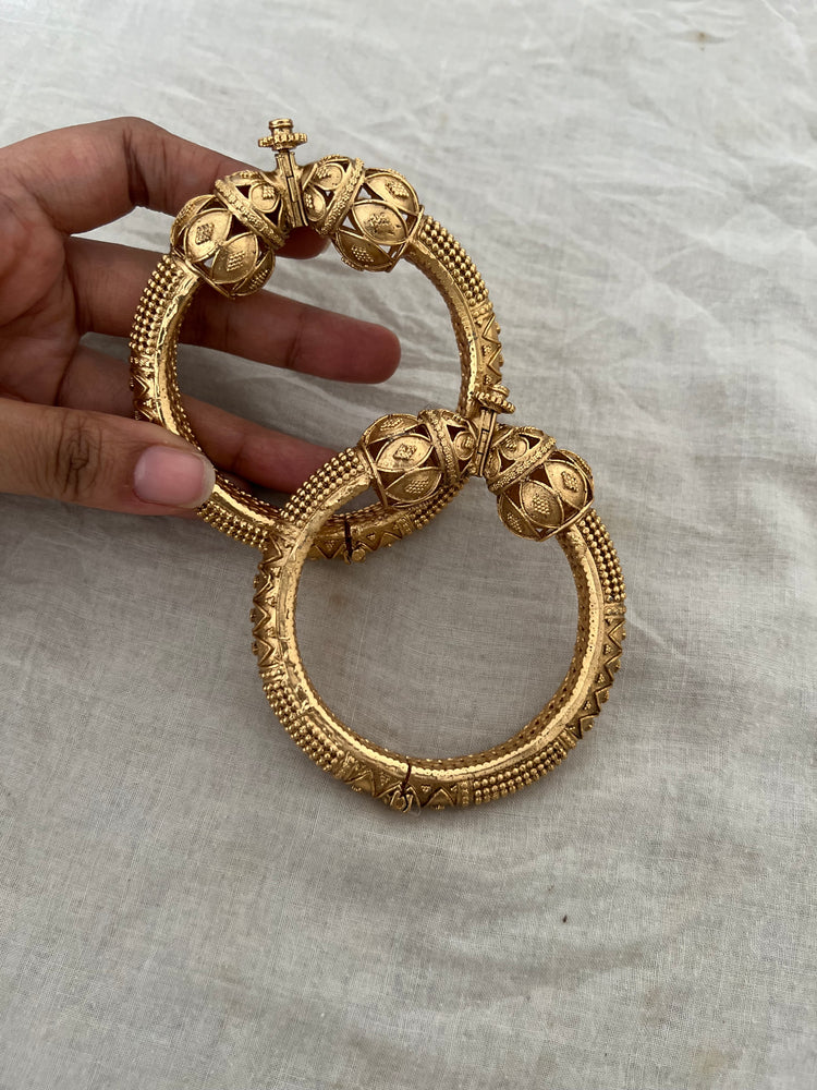 Each kada is a masterpiece of design, featuring magnificent, oversized spherical terminals that also function as the clasp. These globes are exquisitely detailed with a delicate, openwork floral filigree, creating a sense of lightness within the powerful form. The clasp is crowned with a single, vibrant kemp stone, and the body of the bangle is richly textured with fine granulation work. The entire piece is bathed in a warm, antique gold finish, lending it a formidable and distinguished heirloom quality.