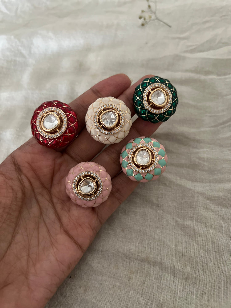 These vibrant rings showcase a playful, quilted dome design in fresh enamel shades including ruby red, ivory off-white, deep emerald, blush pink, and mint green. Each dome is crowned with a brilliant, round kundan centerpiece encircled by gold beading and a subtle pattern of filigree or lattice-style goldwork, merging modern whimsy with regal detailing.