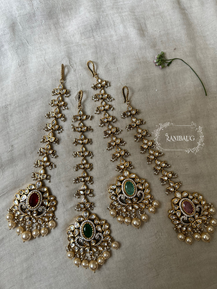 This Ranibaug maang tikka quartet showcases grand oval pendants with vibrant center stones, luxurious pearl cascades, and elaborate polki Kundan artistry—crafted for brides, wedding party members, or anyone seeking opulent traditional elegance.
