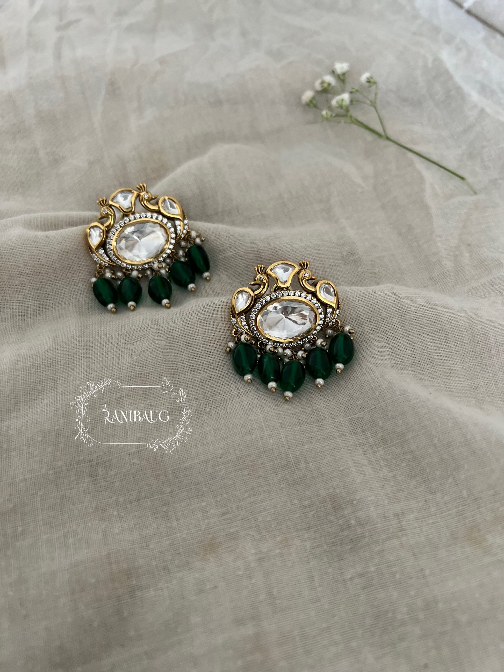 Design: Handcrafted chandbali stud with dual peacock motifs and dangling green bead clusters.