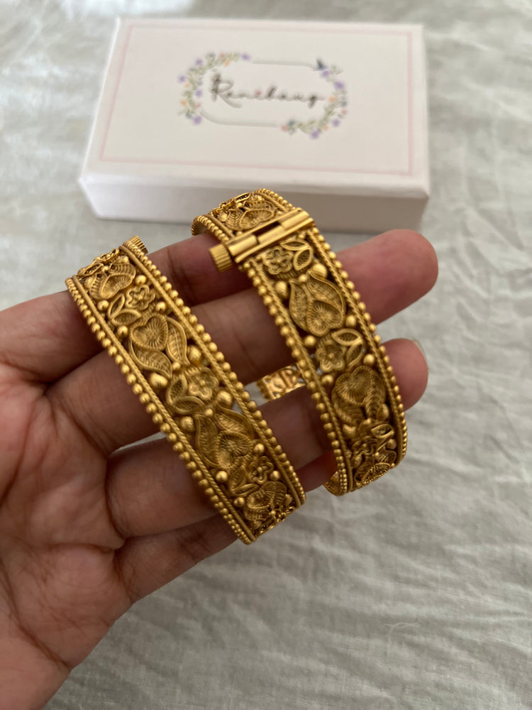 Each kada is masterfully crafted with a central panel showcasing a repeating pattern of stylized paisley and floral elements. The motifs are rendered in high relief, creating a wonderful depth and texture. The design is framed by a delicate, beaded border that adds a touch of refinement. Finished with a warm, antique gold polish, these kadas have the rich appearance of treasured family heirlooms. A robust and ornate hinge clasp ensures a secure fit while seamlessly blending into the overall design.