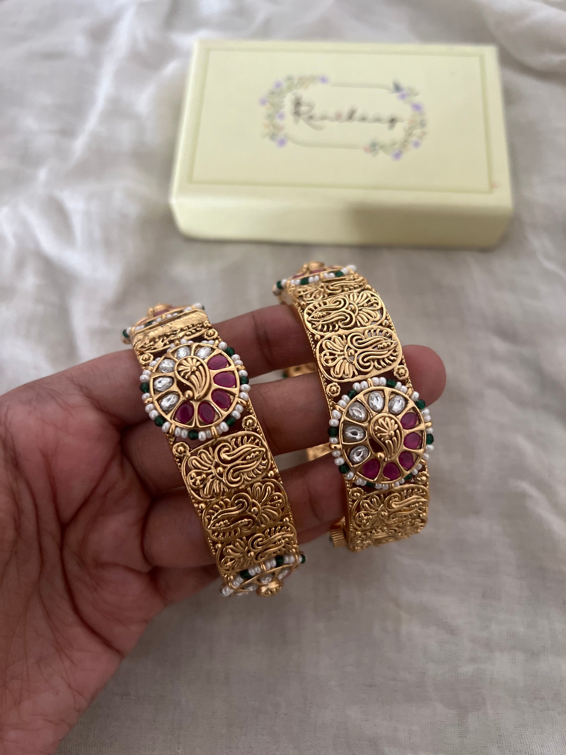 Each kada is a canvas of artistry, featuring a wide band of intricate, traditional carvings. The true splendor of these bangles, however, lies in their magnificent centerpiece—a radial medallion showcasing a stylized peacock (Mayura). The peacock's form is brought to life with vibrant, ruby-red kemp stones and is surrounded by a halo of sparkling kundan and delicate pearls. This stunning focal point is complemented by smaller, ruby-studded floral motifs, all set in a warm, antique gold finish that gives the kadas the undeniable presence of a royal heirloom.