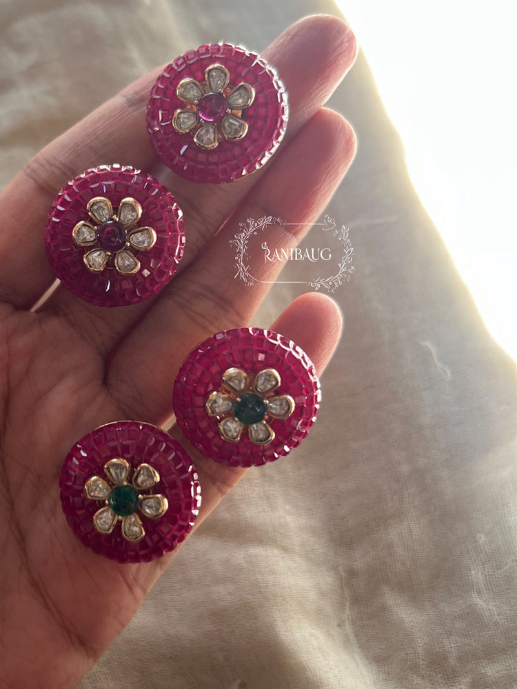 Discover the exquisite Padma Studs from Ranibaug. Handcrafted with a floral polki centerpiece and a vibrant mosaic of ruby-red beads. Available with ruby or emerald centers. These gold-plated statement earrings are perfect for festive and wedding wear.