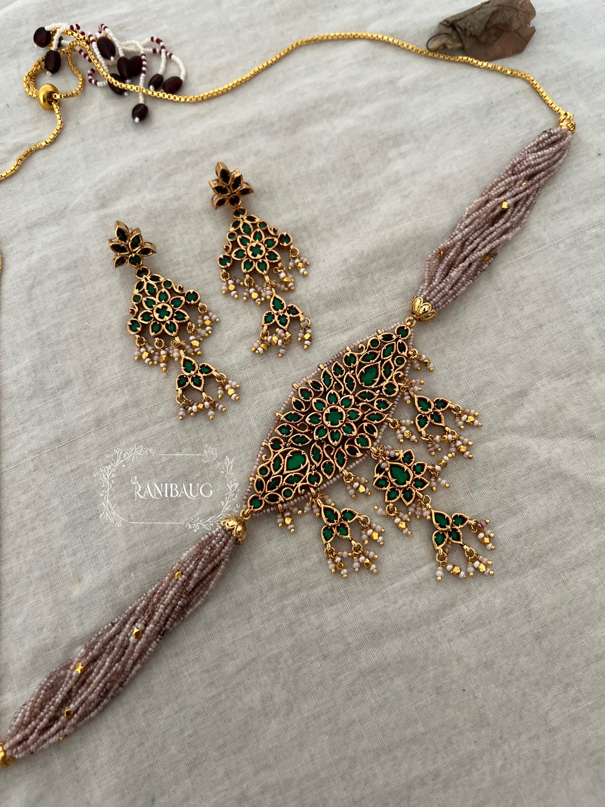 Closure: The necklace features a traditional, adjustable dori for a perfect, regal fit. The earrings have a secure push-back mechanism.