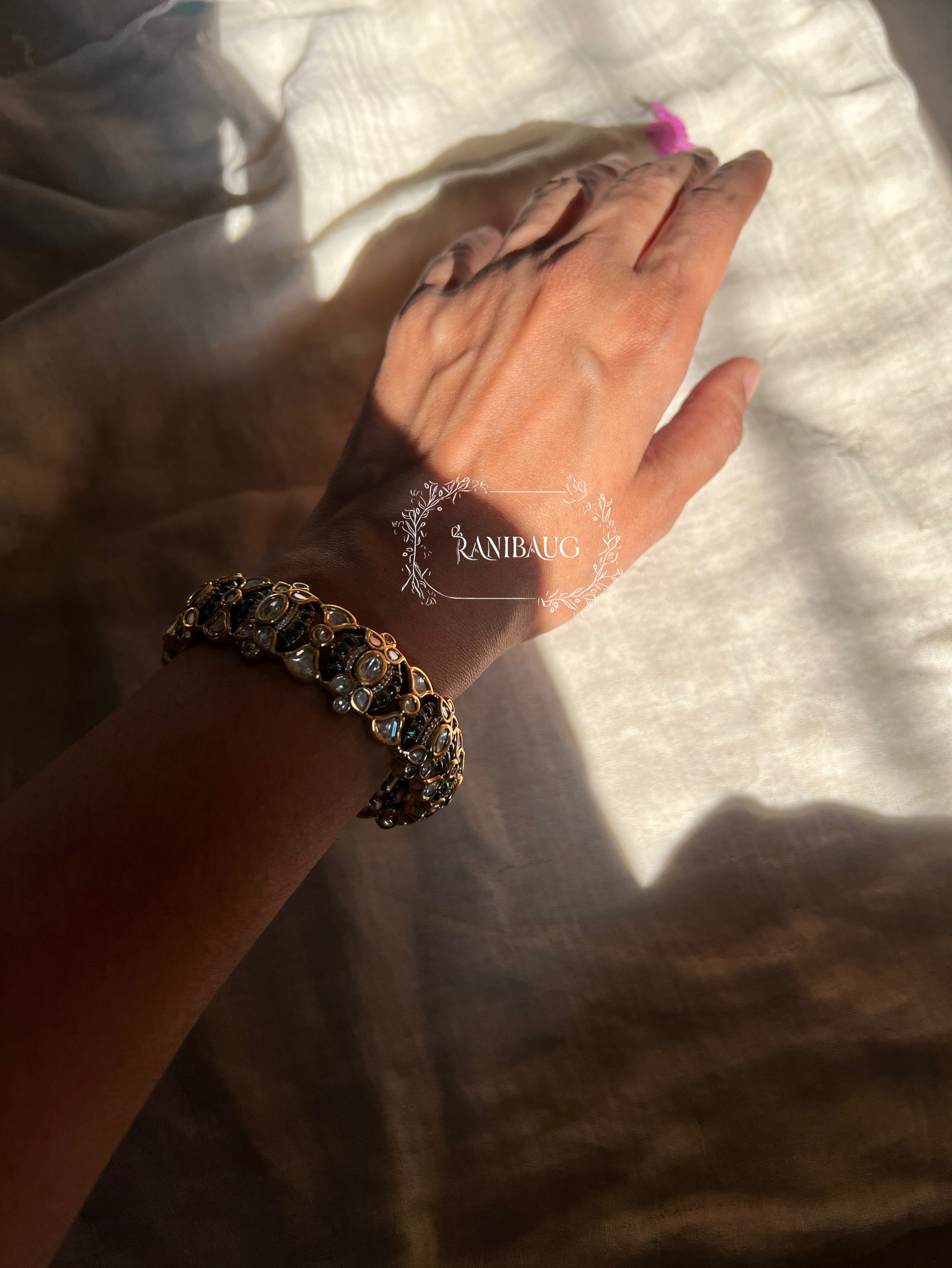 Inspired by the deep, dramatic beauty of a Rajasthani forest at twilight, the "Ranthambore" Kada is a masterpiece of contrast and light. This magnificent handcrafted bangle is designed for the woman who commands attention, a true connoisseur of heritage jewelry that tells a story of power, mystery, and regal elegance.