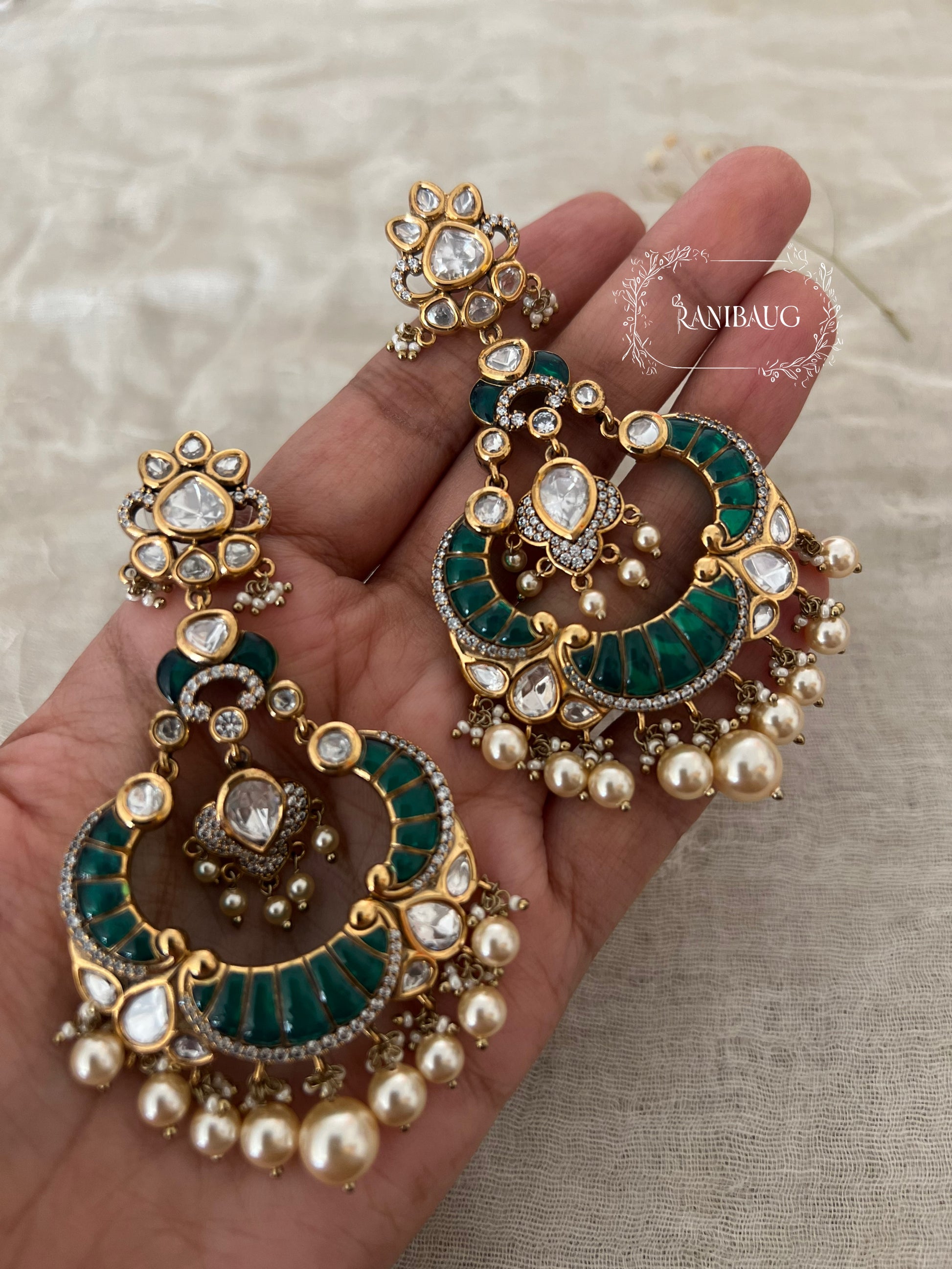 Imagine youRself at your next big celebration, wearing the Ranibaug Chandni Victorian Finish Antique Gold Traditional Earrings Chandbali—these earrings are simply magical. The deep emerald green enamel and sparkling kundan details instantly catch the eye, while the dramatic double crescent design and lush pearl fringe bring a regal flair that feels special and peRsonal, not just for anyone but for you. The blend of tradition and bold color makes this pair a true standout; they sway gracefully with every movement, ensuring you feel confident and unique at every event. If you love jewelry that’s more than just an accessory—something that really tells your story and highlights your festive spirit—these earrings are the perfect, show-stopping choice for you.