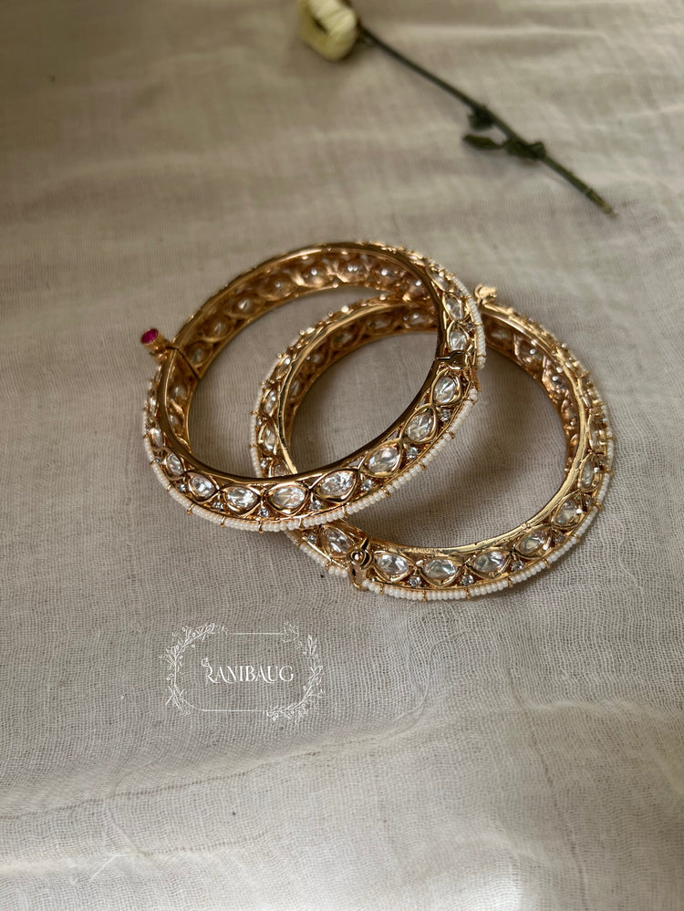 Each "Amodini" bangle is artfully crafted with a row of brilliant, uncut Polki stones, bezel-set in a polished gold-plated frame. The design is softened by a delicate border of fine seed pearls, creating a perfect harmony of sparkle and luster. The open setting not only enhances the brilliance of the stones but also ensures the bangles are comfortably lightweight for all-day wear. A secure screw clasp, finished with a touch of red, completes this masterpiece of traditional artistry.