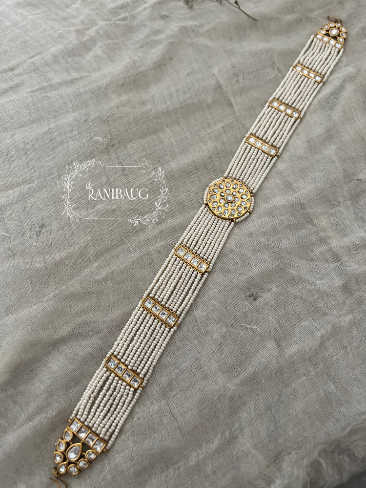 Ranibaug’s Regal Pearl Kundan Sheesh Patti—a contemporary classic that combines rows of elegant pearls with striking kundan accents. This sheesh patti features a broad band of fine pearl strands, highlighted by a central circular kundan medallion, Victorian gold-plated rectangular kundan bars, and a tapered kundan-embellished end, making it perfect for both traditional and modern celebrations.