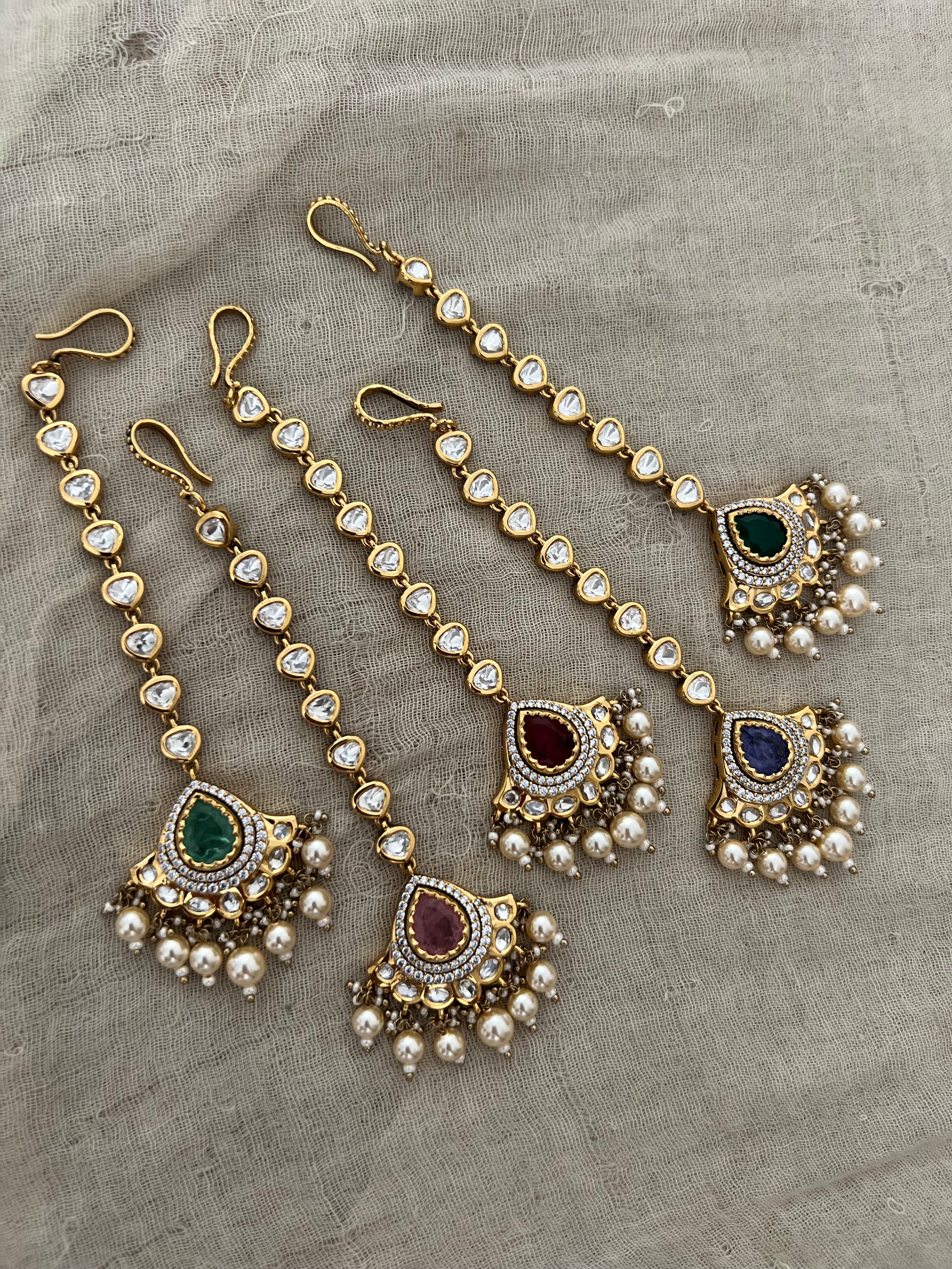 ⦁ Pair the emerald, ruby, or sapphire tikkas with matching sarees, lehengas, or shararas for a classic wedding or celebration look—coordinate with bangles or earrings for added harmony.
