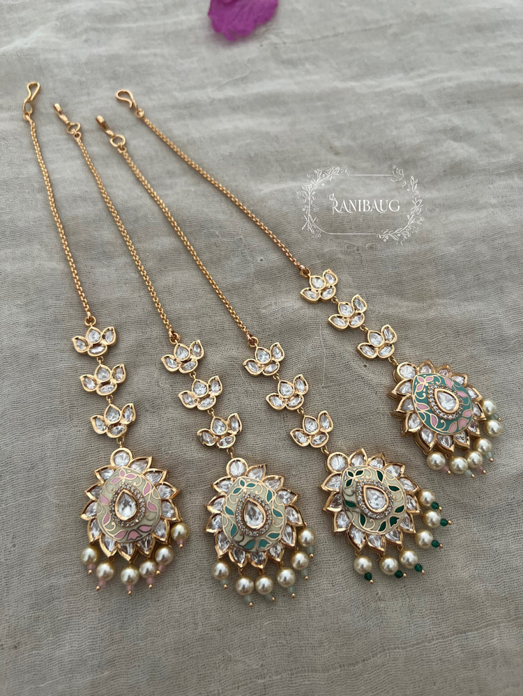 This Ranibaug jewelry collection presents an enchanting series of teardrop enamel polki maang tikkas designed to celebrate tradition with a splash of pastel artistry and elegant details—perfect for festive or bridal styling.