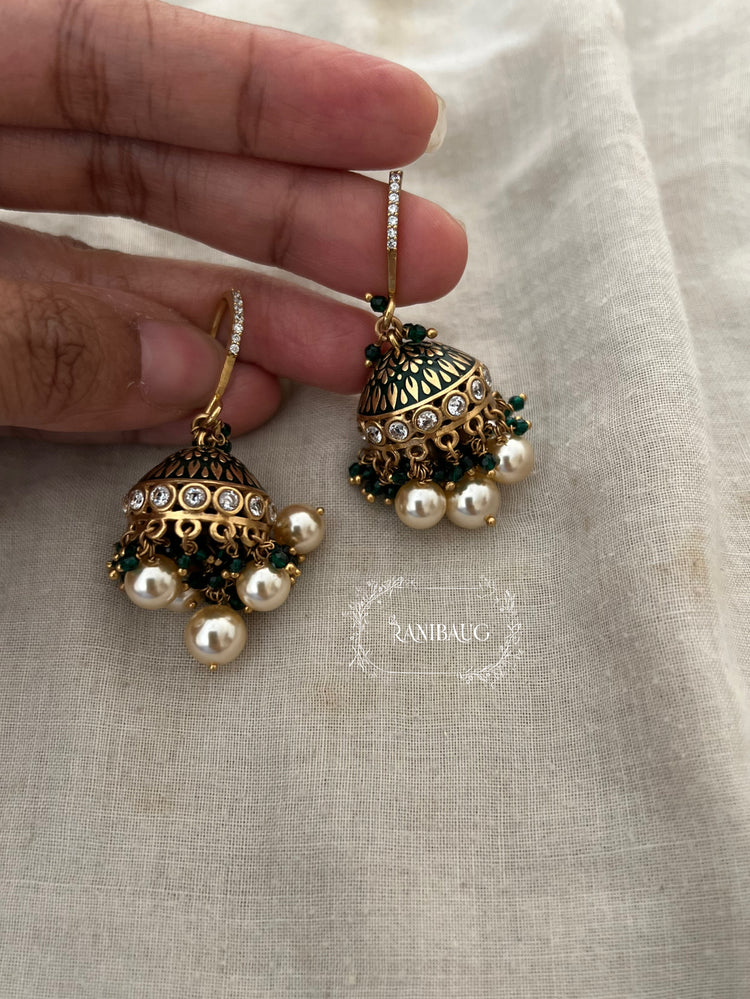 Design: Dome-shaped jhumkas with pearl and bead drop detailing