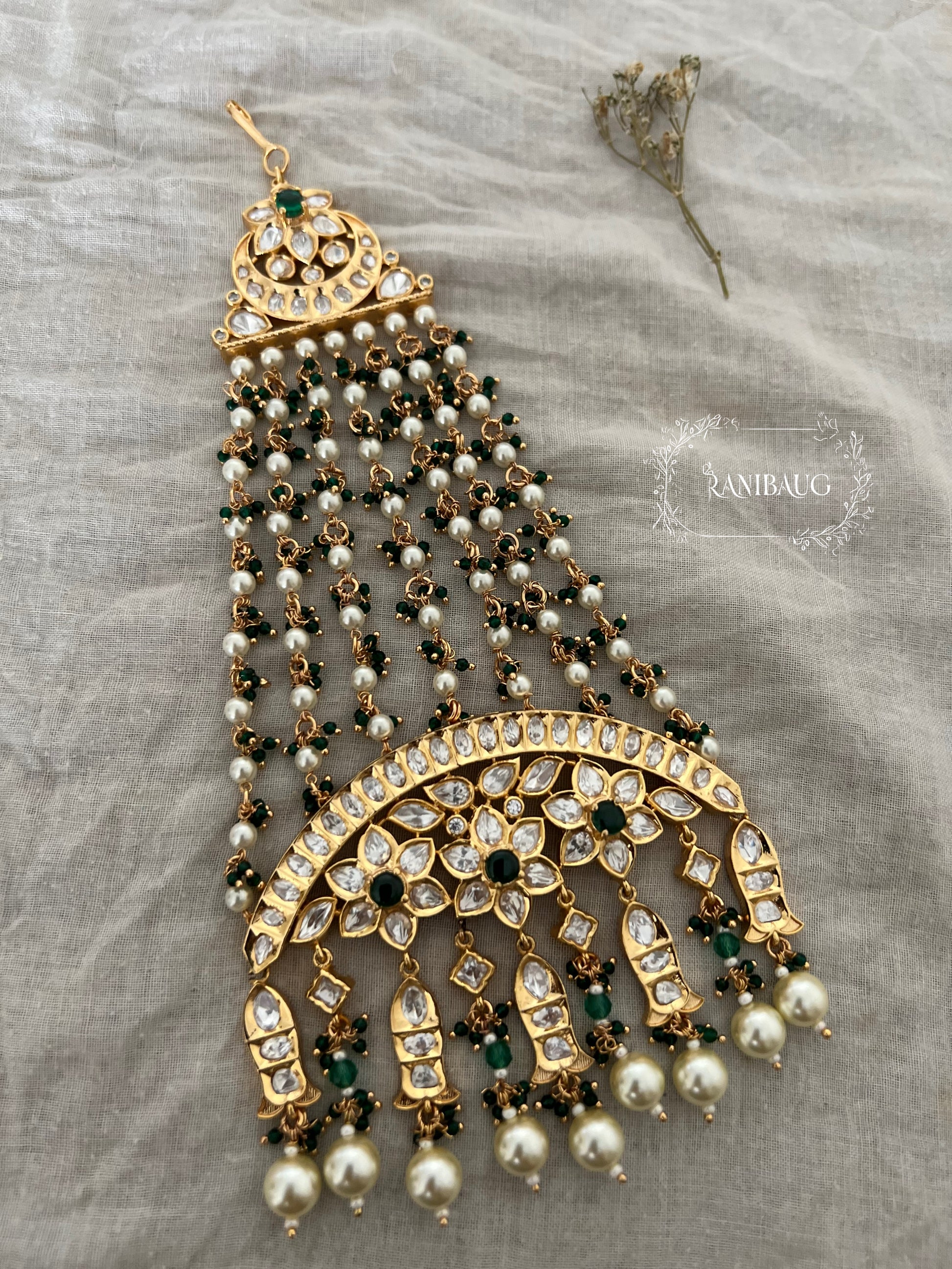 The Ranibaug Kundan & Pearl Drape Passa is the best piece for those wanting to combine traditional adornment with modern-day color—designed for happy celebrations and pre-wedding traditions that are unforgettable, and flawless bridal portraits.