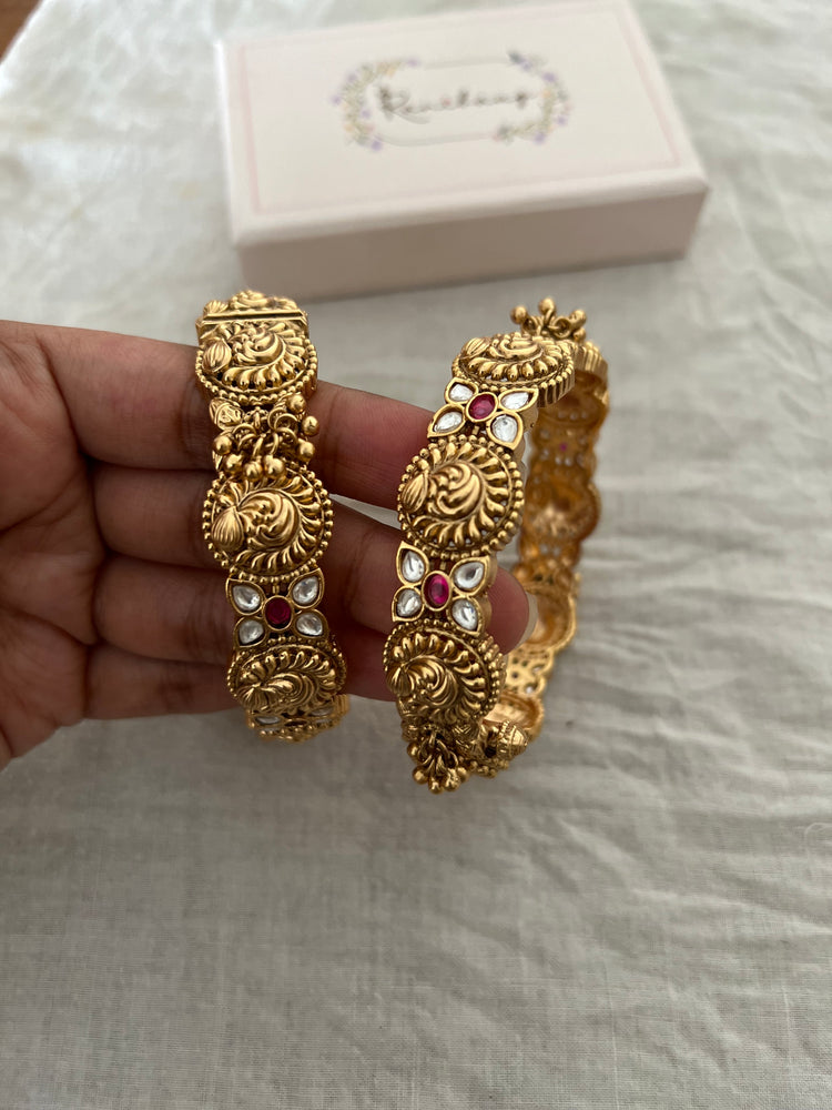 Each kada is dominated by magnificent, oversized circular medallions that feature a swirling, paisley-inspired pattern, reminiscent of a peacock in its full glory. These powerful central elements are flanked by elegant stations of brilliant kundan stones and a central, fiery red gem, which add a vibrant splash of color. The entire piece is crafted in a rich, antique gold finish, enhancing the depth of the carvings and lending the kadas a distinguished, heirloom quality.