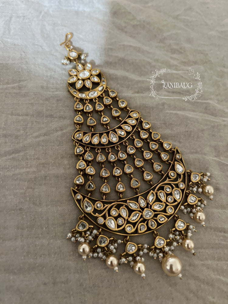 Presenting the Ranibaug Triple Chandbali Kundan Passa - a stunning Indian bridal piece that marries royalty, heritage, and couture sophistication all in one. This one-of-a-kind passa is sure to attract attention with its 3 crescent (chandbali) arcs that boast a carefully tiered layout, and it features hand-set beautiful kundan stones, shining pearl drops for drama and sparkle.