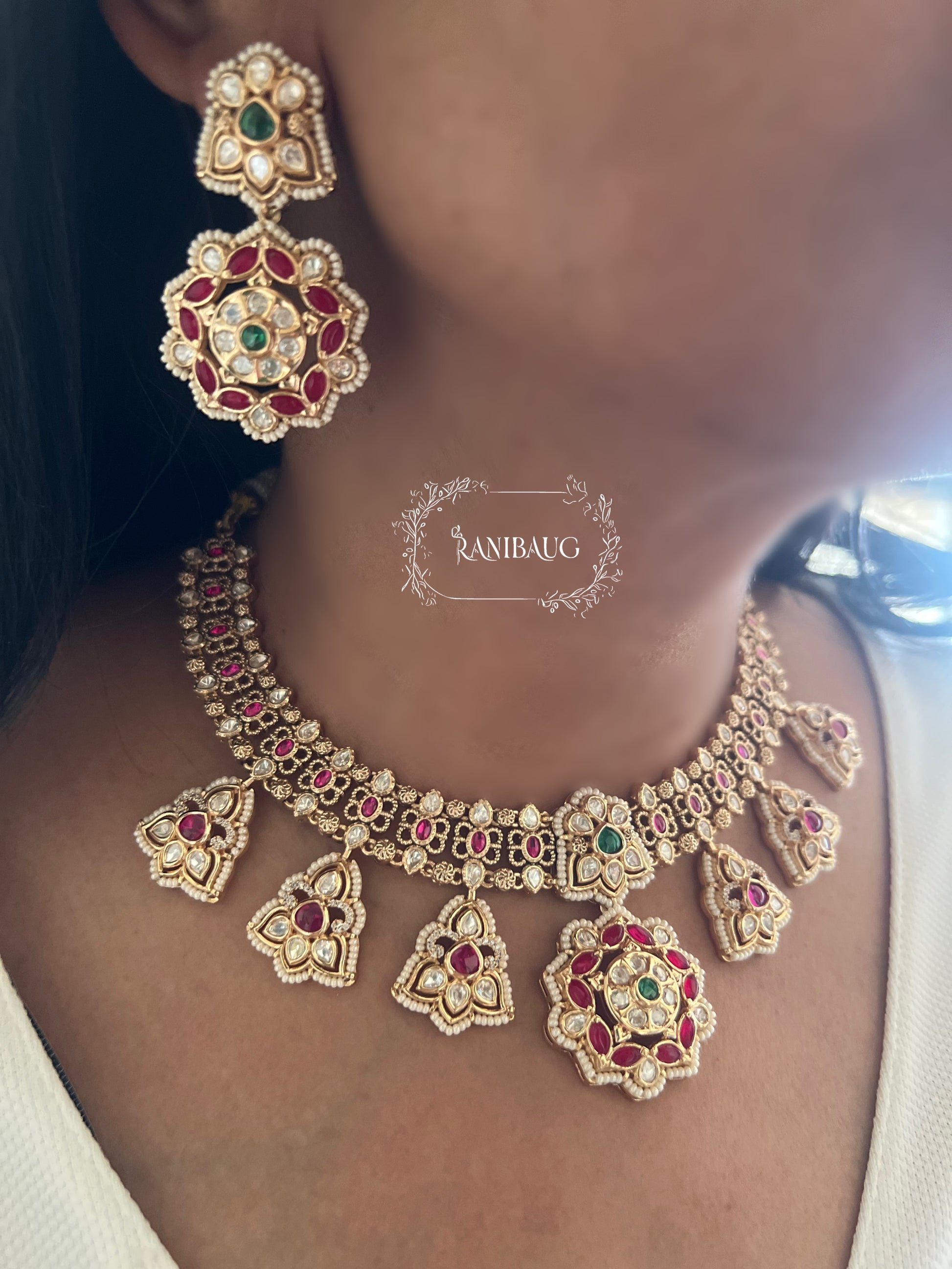 The matching earrings are equally stunning, featuring a double floral design that perfectly complements the necklace's motifs. This is a set designed to be a conversation starter at any elegant affair.