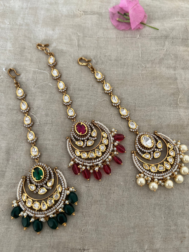 ⦁ Pair with classic pearl or delicate Kundan studs and keep accompanying jewelry simple to highlight the tikka’s heritage motif.