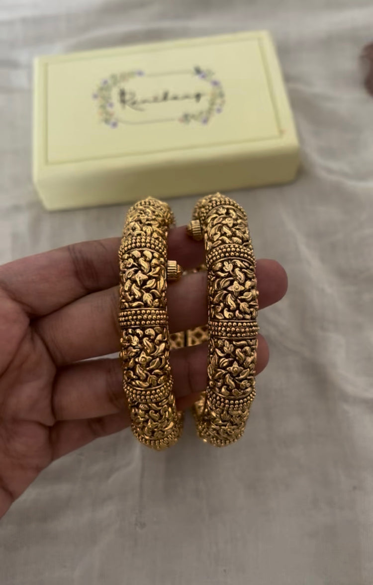 Wrap your wrists in a golden forest with this exquisite pair of antique-style kadas. Inspired by the dense, organic patterns of nature, these bangles are a testament to masterful craftsmanship, designed for those who appreciate jewelry with rich texture and timeless appeal.