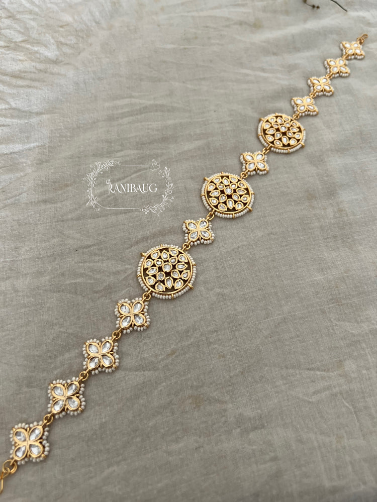 Ranibaug’s Medallion and Clover Kundan Sheesh Patti—a graceful blend of tradition and fresh design. This sheesh patti features alternating kundan-embellished round medallions and intricate four-petal clover links, giving a harmonious pattern that’s both eye-catching and refined for weddings, festivals, or special family occasions.