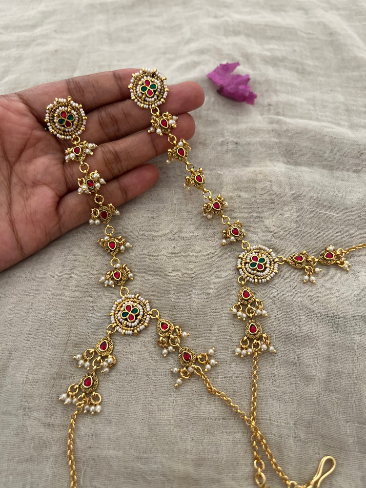 Add vibrant tradition and festive flair to your attire with this colorful floral round haathphool by Ranibaug. This beautiful hand jewellery is meticulously handcrafted in premium gold finish, featuring intricate floral motifs with radiant red and green accents at the center, bordered by petite pearl beads for a look that truly pops.