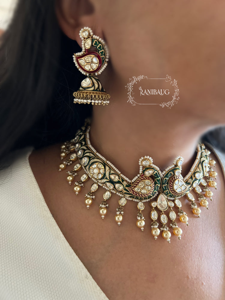 This exquisite necklace curves along the neckline in a regal paisley-peacock motif, adorned with hand-set uncut polki stones and intricate enamel work in deep emerald and rich ruby tones. Each sculpted flourish is bordered with delicate detailing, evoking the artistry of royal ateliers.