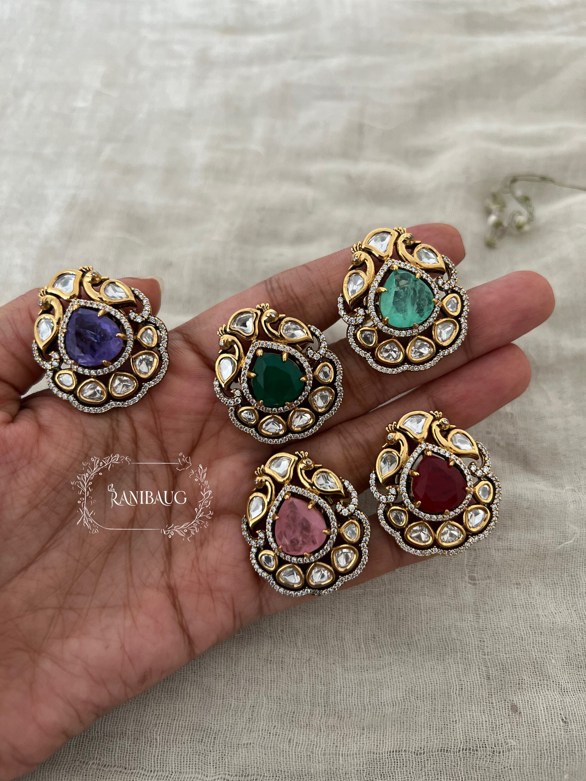 These rings showcase an ornate paisley design, each centered around a large, vibrant gemstone and adorned with intricate kundan and peacock motifs. Available in a rich palette of deep violet, emerald green, ruby red, and soft pink, these pieces are a celebration of color, craftsmanship, and traditional Indian symbolism.