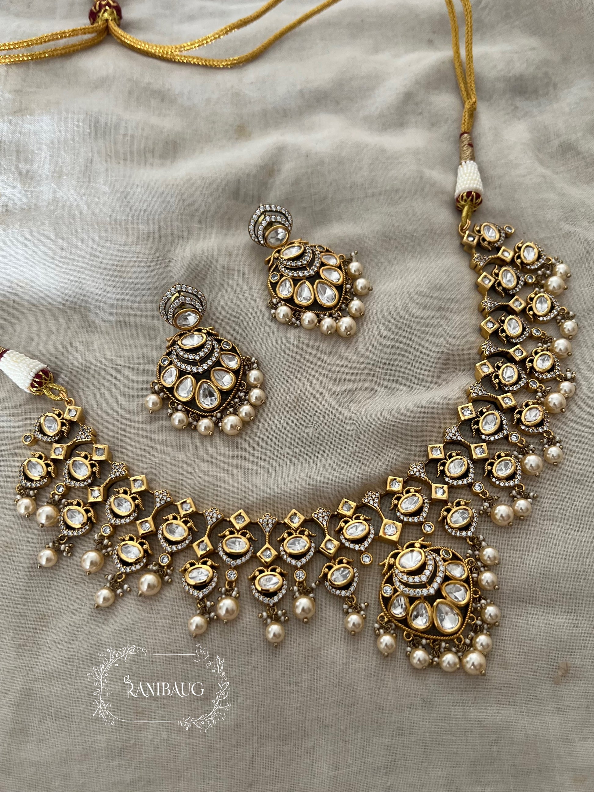 The necklace unfolds in a breathtaking cascade of intricately layered motifs, each centered with a luminous Kundan stone. These are encircled by a scintillating ring of zircons and set against a darkened, antique finish that creates a dramatic, three-dimensional effect. This majestic arrangement is further enhanced by clusters of lustrous pearls that dangle with graceful elegance. The magnificent oversized earrings are a masterpiece in themselves, mirroring the central design of the necklace and promising to frame your face in a halo of royal light.