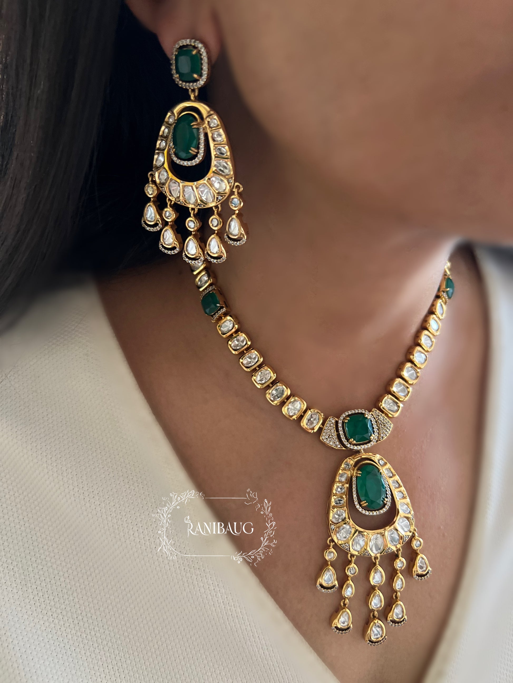 This striking jewelry set showcases a modern twist on classic Mughal-inspired design with a focus on geometric opulence and emerald hues. The necklace’s chain is a sequence of square and round Kundan stones, punctuated beautifully with lush green enamelled accents. At the center sits a dramatic oval pendant featuring a rich green stone bordered by Kundan and zircon surrounds, gracefully finished with five cascading lines of pear-shaped Kundan drops. Each earring echoes the pendant in miniature, featuring matching green stones, intricate setting, and the same elegant dangle.