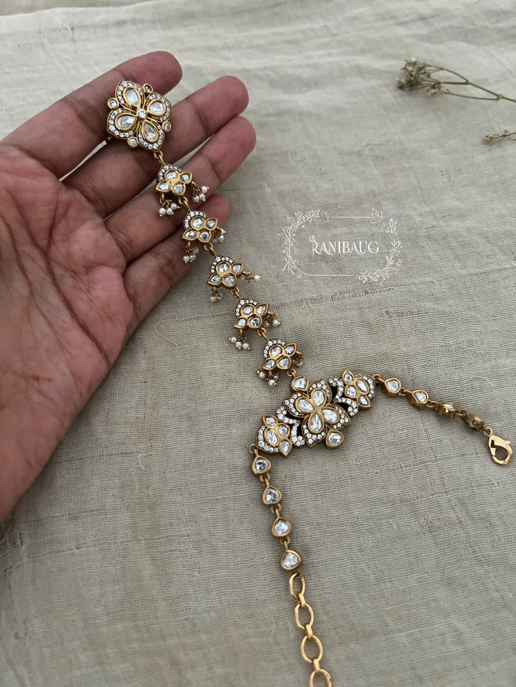 The delicate floral links are interspersed with tiny pearl drops, lending elegance, texture, and gentle movement. A symmetrical design flows from the finger ring to the central medallion and seamlessly wraps around the wrist with sparkling round kundan links and an adjustable clasp for a secure, comfortable fit.