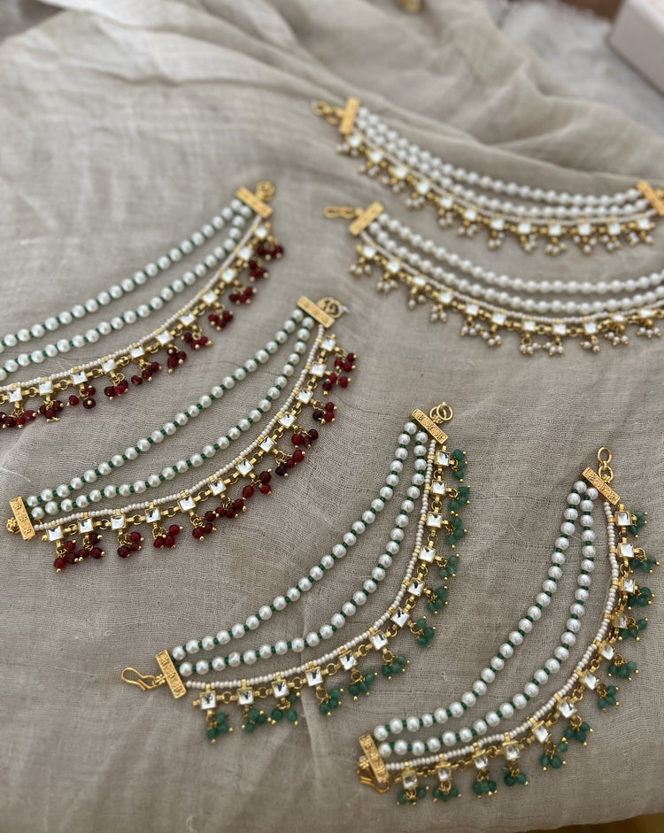 The Tarini chains are defined by their clean, architectural design. Three parallel strands of lustrous, mint-toned pearls create a look of layered luxury. The innermost strand is adorned with modern, square-shaped Kundan-style stones, from which dangle rich clusters of colorful, faceted beads. This bold combination of linear structure and vibrant accents makes the Tarini a truly unique and captivating accessory, available in three exquisite variations.