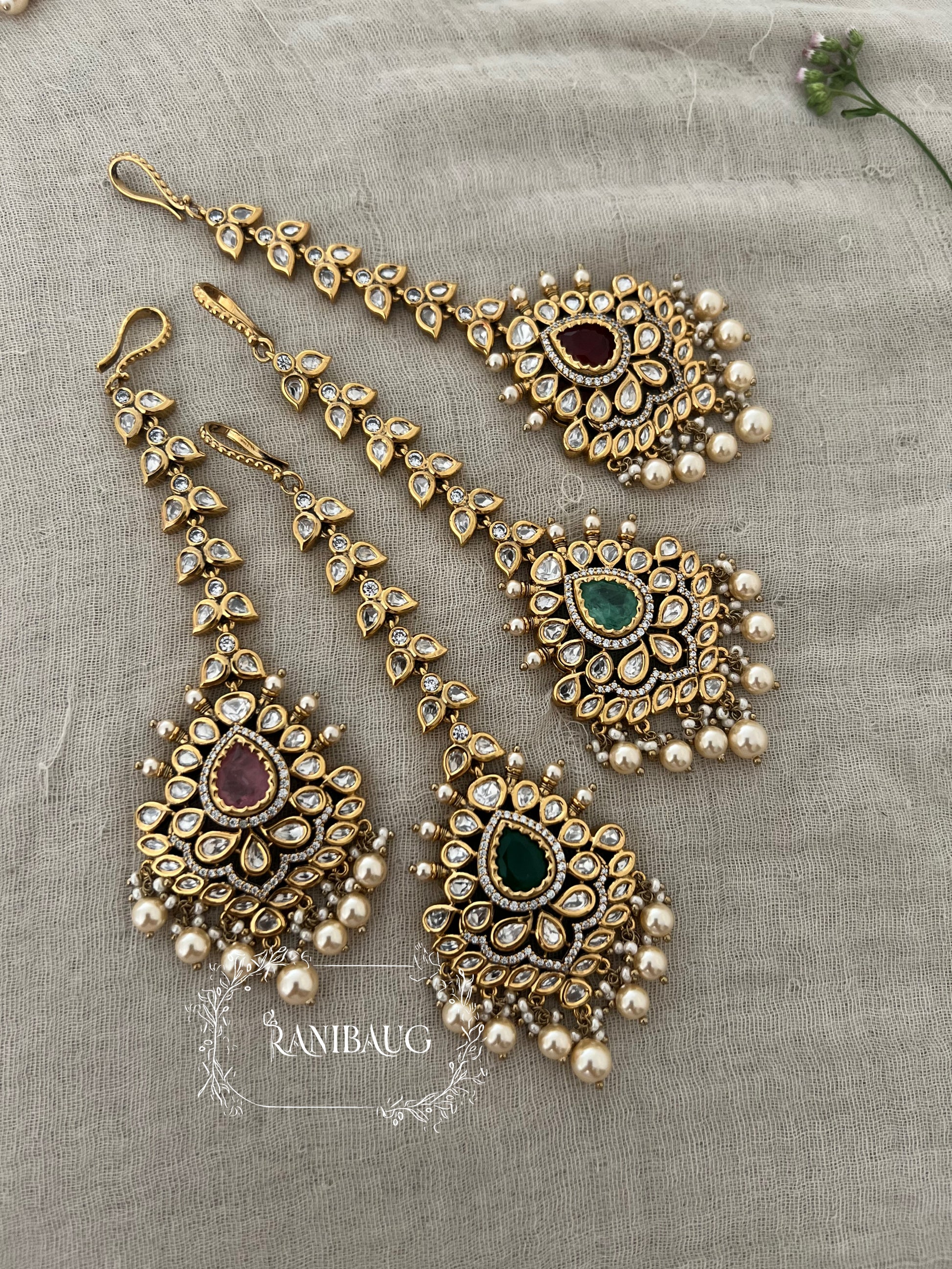 These Ranibaug teardrop Kundan maang tikkas are a tribute to traditional artistry, luxury, and showpiece style—crafted for memorable moments and standout photographs.