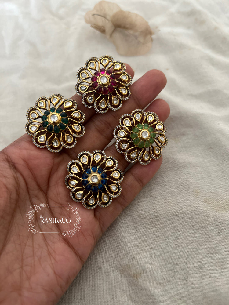 ⦁ Floral circular design with a raised kundan stone at the center, surrounded by vivid meenakari-colored petals (red, blue, green, yellow) for distinct visual identity.